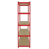 - Red racking system with 5 shelves, all with the ability to place at adjustable heights.